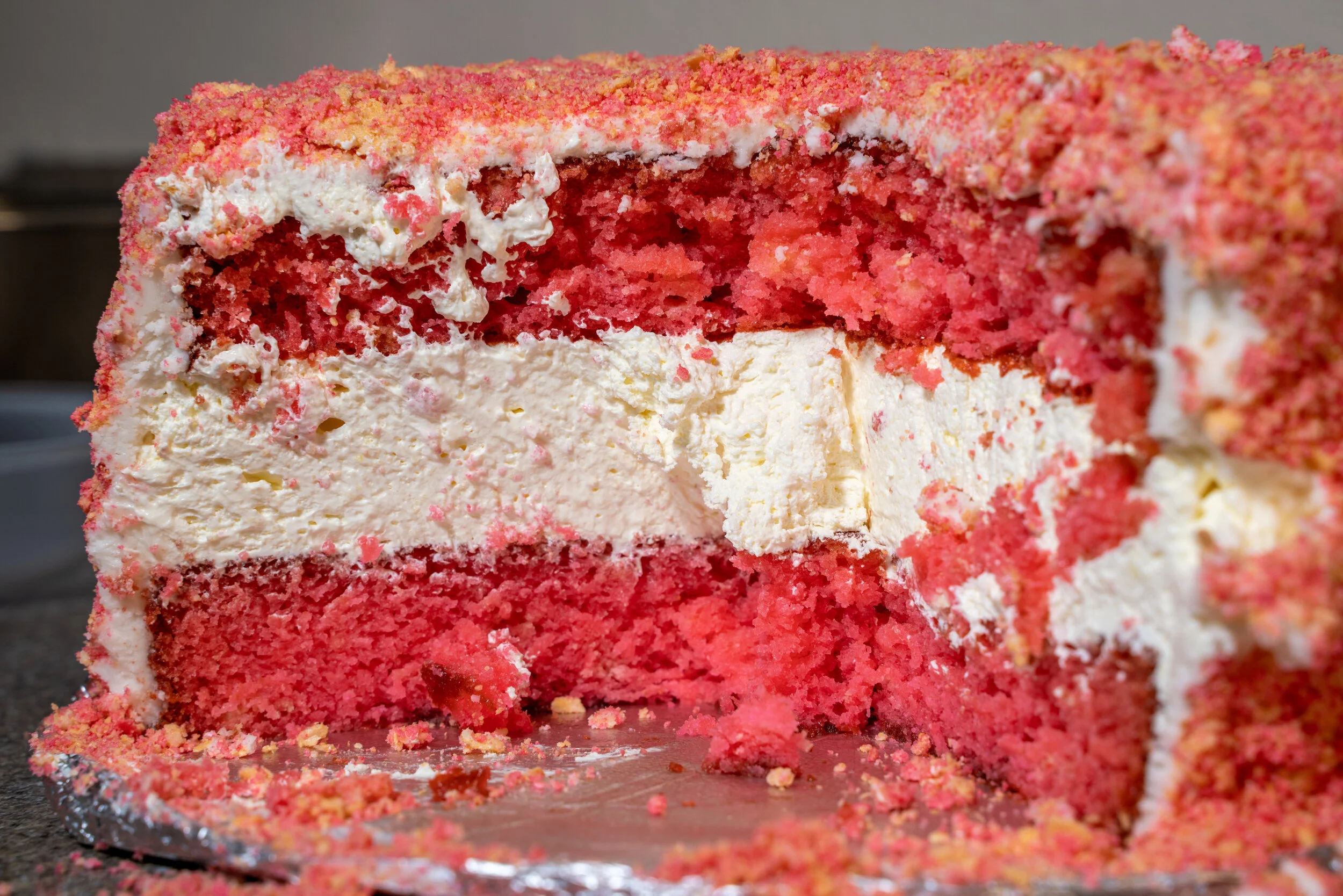 Strawberry Cake with OG refrigerated cheesecake middle layer, topped with butter cream icing and our crunch mix.